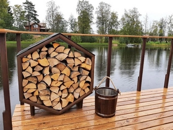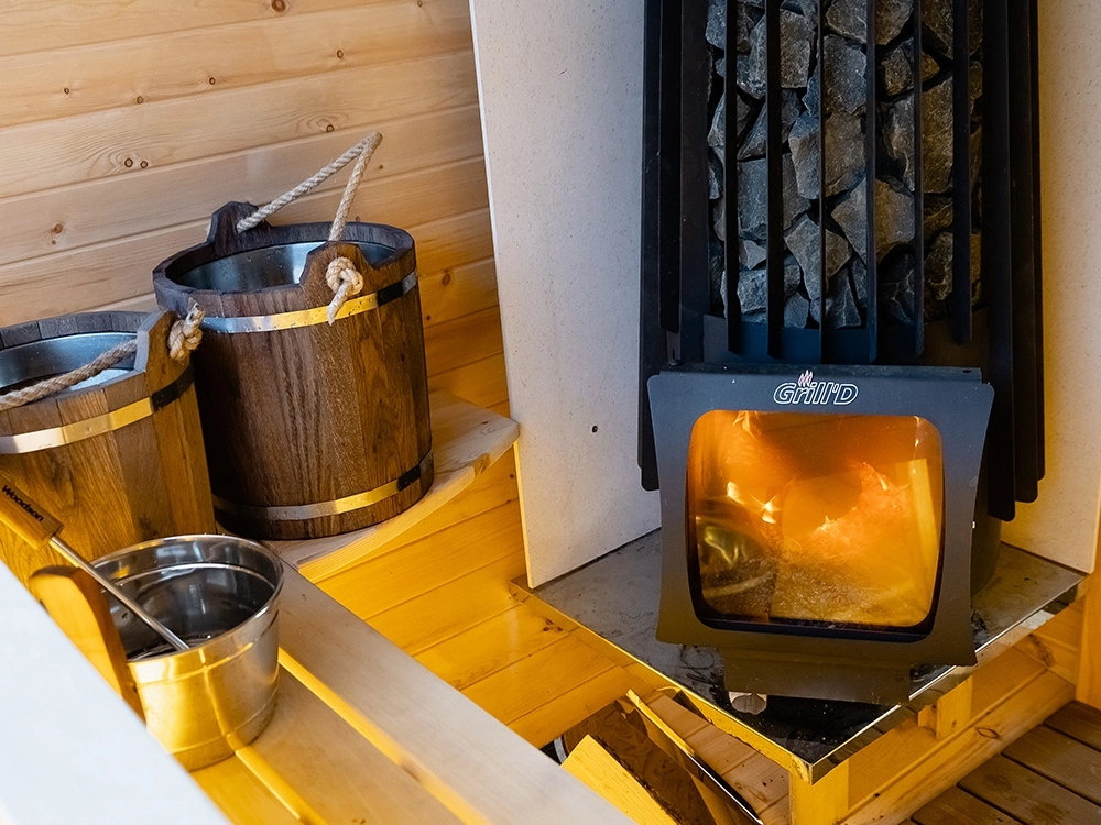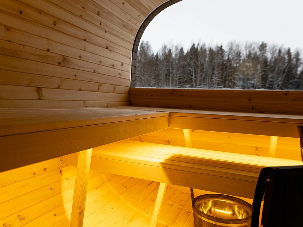 Внутри есть стильная комната отдыха, в парной — панорамное окно, через которое вы можете любоваться красотой окружающей.