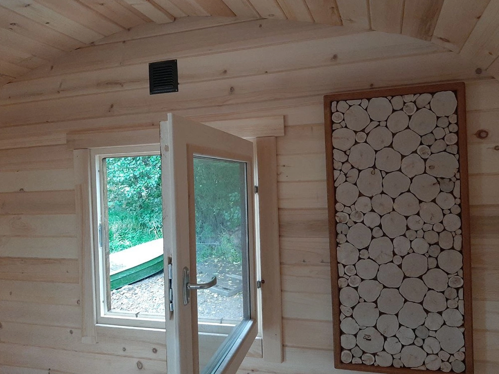 За счет круглой формы, воздух в бане-бочке прогревается при помощи 7-8 поленьев за 20-30 минут даже при сильных морозах.