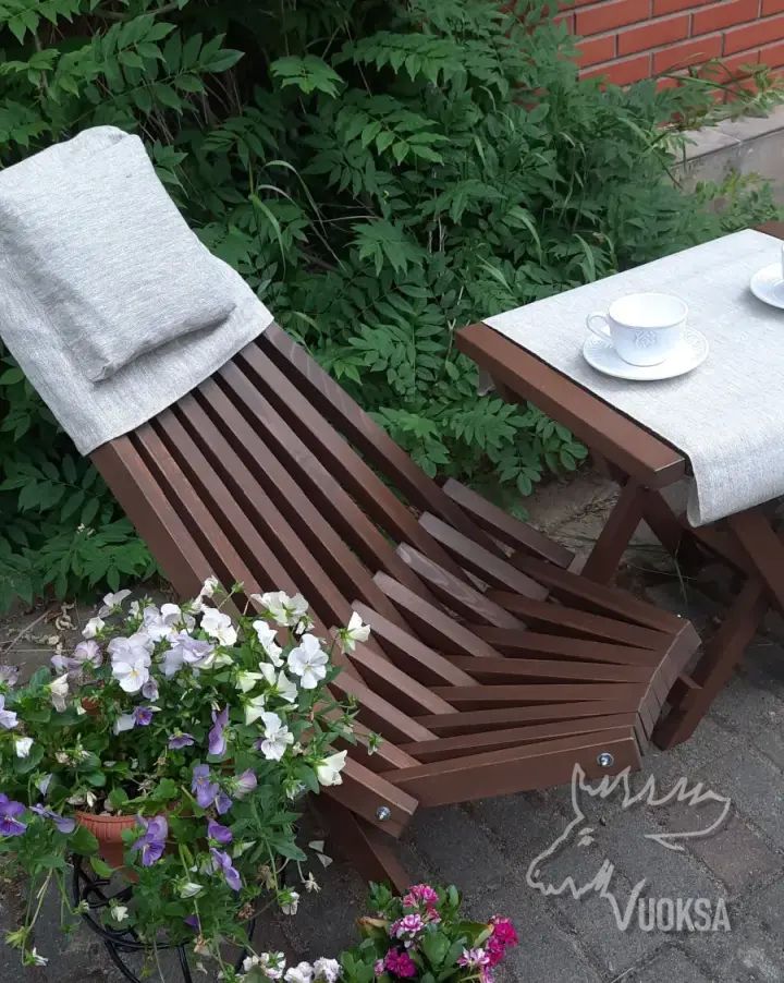 Дачная садовая мебель в коричневом цвете выглядит утонченно, изысканно и элегантно, способствует к комфортному длительному времяпрепровождению на природе, в саду. Садовые кресла со спинкой позволят вам удобно на них расположиться и отдохнуть. Кофейный столик выполнен в одной стилистике с деревянными креслами-шезлонгами. Удобный подголовник на кресла идет в комплекте, выполнен из льняной ткани с наполнителем из ароматных луговых трав.