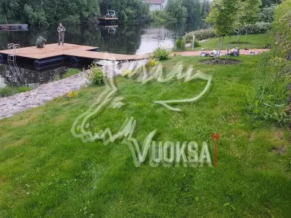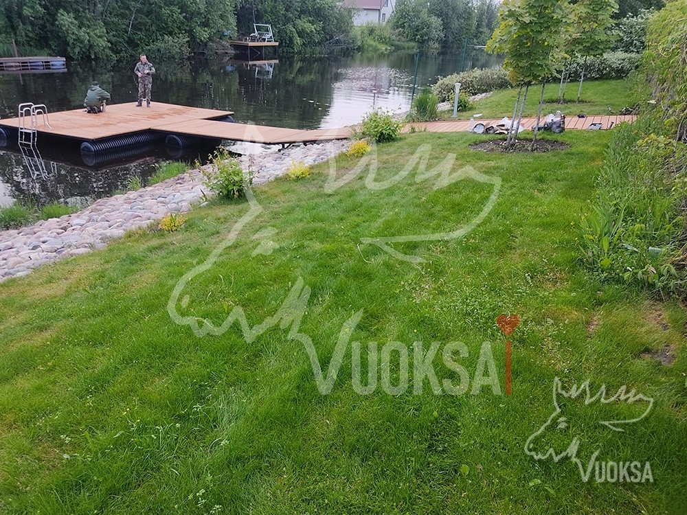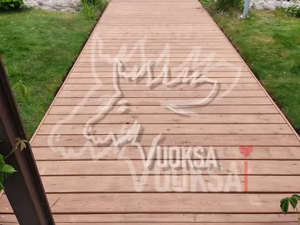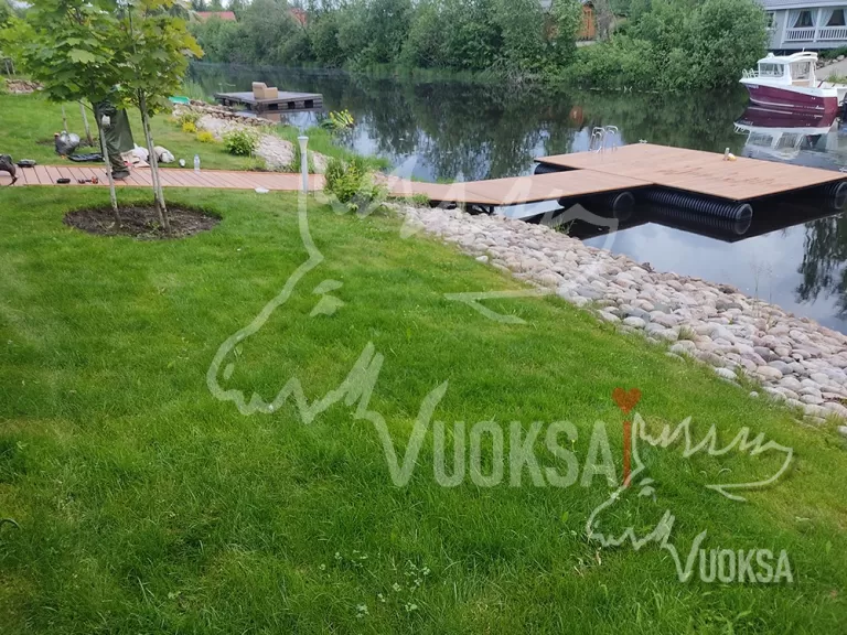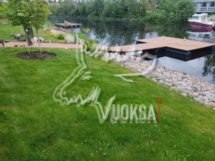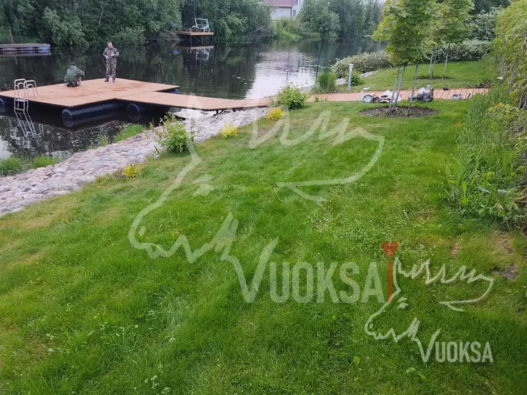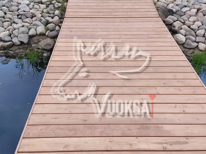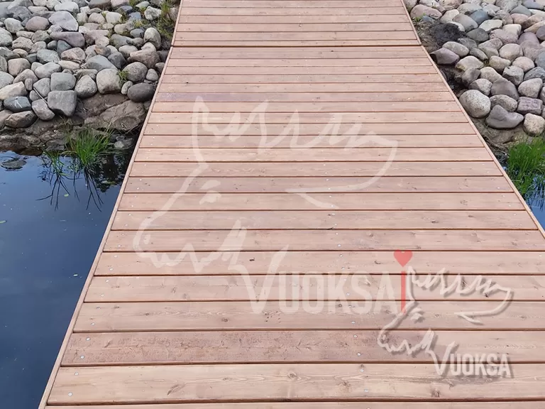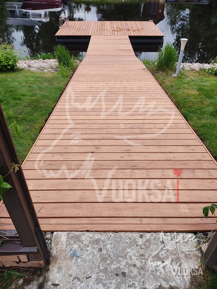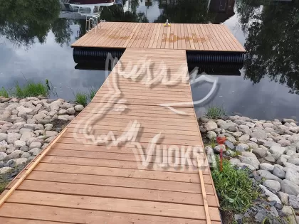 Плавучий пирс со сходнями и береговой террасой из лиственницы.