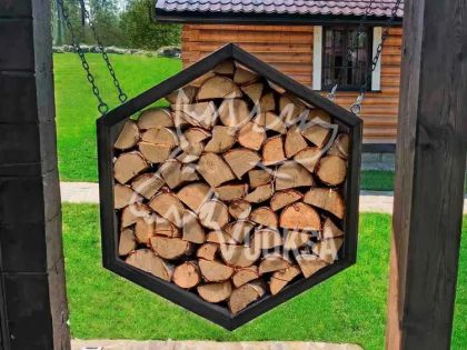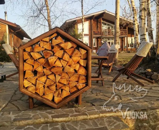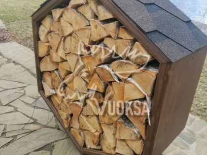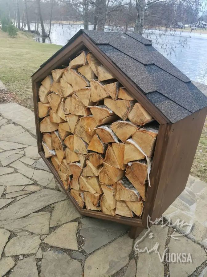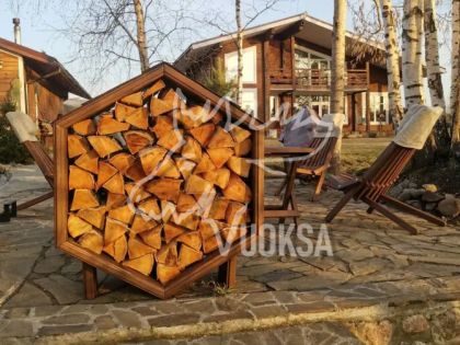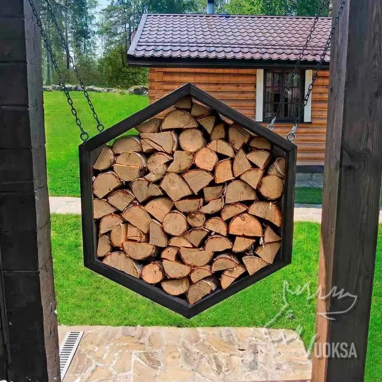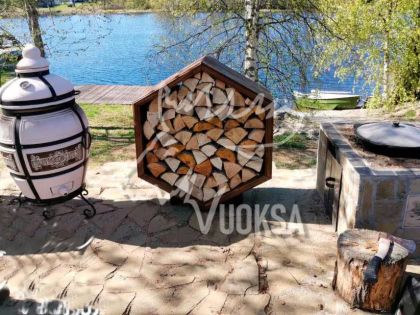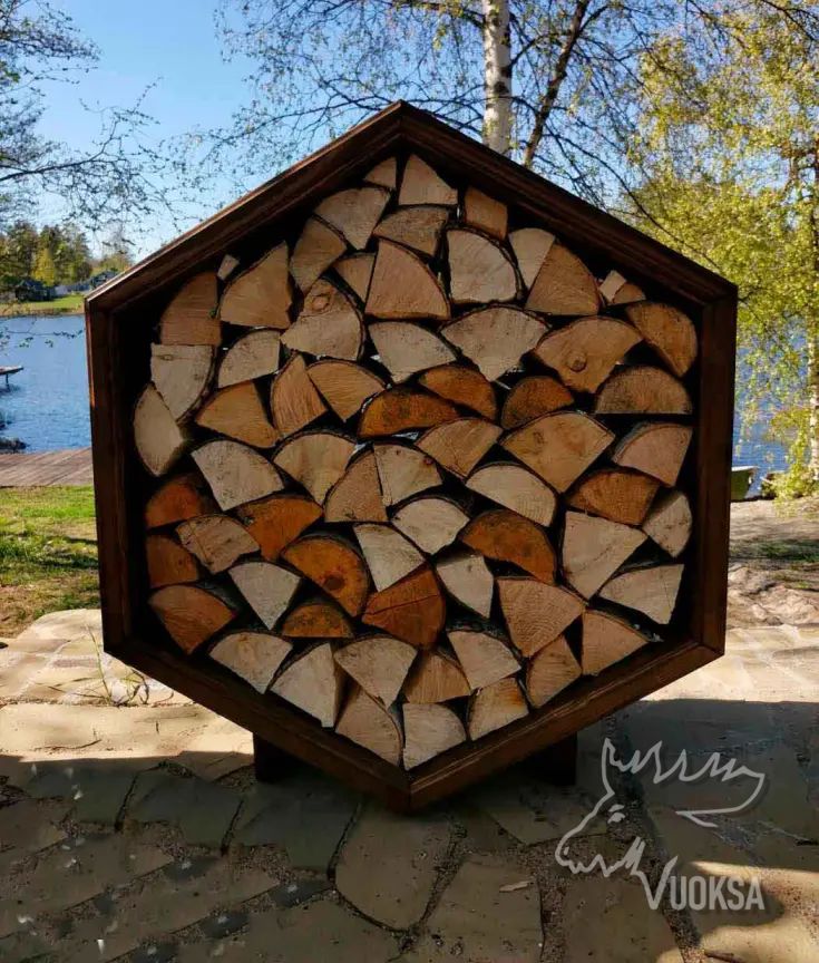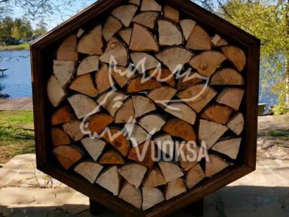 Размеры деревянной поленницы VUOKSA-WOOD в собранном виде: Высота - 100 см., ширина - 87 см., глубина - 40 см., вместимость дров - 0,25 м3. Оригинальная конструкция дровницы (поленницы) позволяет легко дополнить ее новыми сотами, при необходимости увеличить объем хранения дров. Такой уличный дровник из дерева выглядит как настоящее архитектурное украшение. В нем можно комбинировать различные виды дерева, создавая узоры, ведь дровница из дерева в форме соты-это современный элемент украшения ландшафтного дизайна сада, террасы или приусадебного участка.
